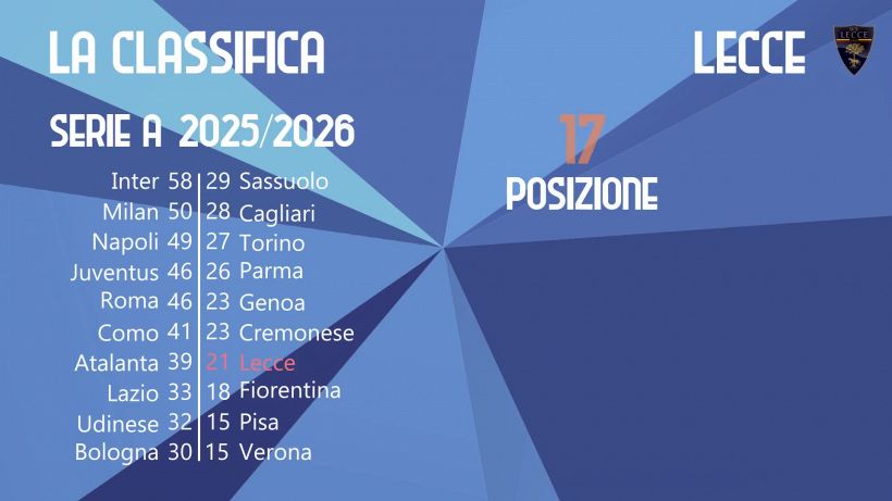 Lecce (4-3-3): Falcone; Baschirotto, Pongracic, Umtiti (44’ s.t. Gendrey), Gallo; J. Gonzalez (44’ s.t. Helgason), Blin, Askildsen (24’ s.t. Bistrovic); Strefezza (44’ s.t. Oudin), Ceesay, Banda (29’ s.t. Di Francesco). All. Baroni