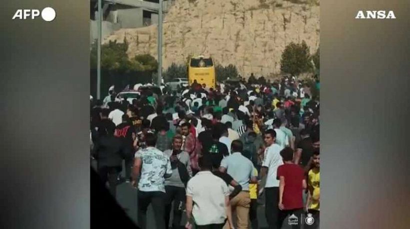 Febbre da Ronaldo e CR7 mania a Teheran, in Iran, in vista della partita Persepolis-Al Nassr. I tifosi iraniani corrono lungo una strada per vedere Cristiano Ronaldo mentre viene portato via sull’autobus della squadra Al Nassr a Teheran. Il club saudita e’ nella capitale iraniana per disputare la partita della fase a gironi della AFC Champions League contro il Persepolis.